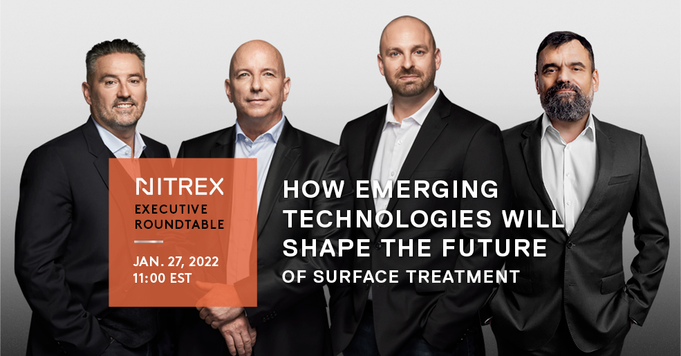 EXECUTIVE ROUNDTABLE NOW AVAILABLE TO WATCH https://youtu.be/MYGr715rRxU HOW NITREX EMERGING TECHNOLOGIES WILL SHAPE THE FUTURE OF SURFACE TREATMENT As a future-focused company, Nitrex is propelling new innovations in Digital Transformation and Sustainability. To see what new developments are coming in 2022, we are going straight to the source. Our CEO and Division Presidents will come