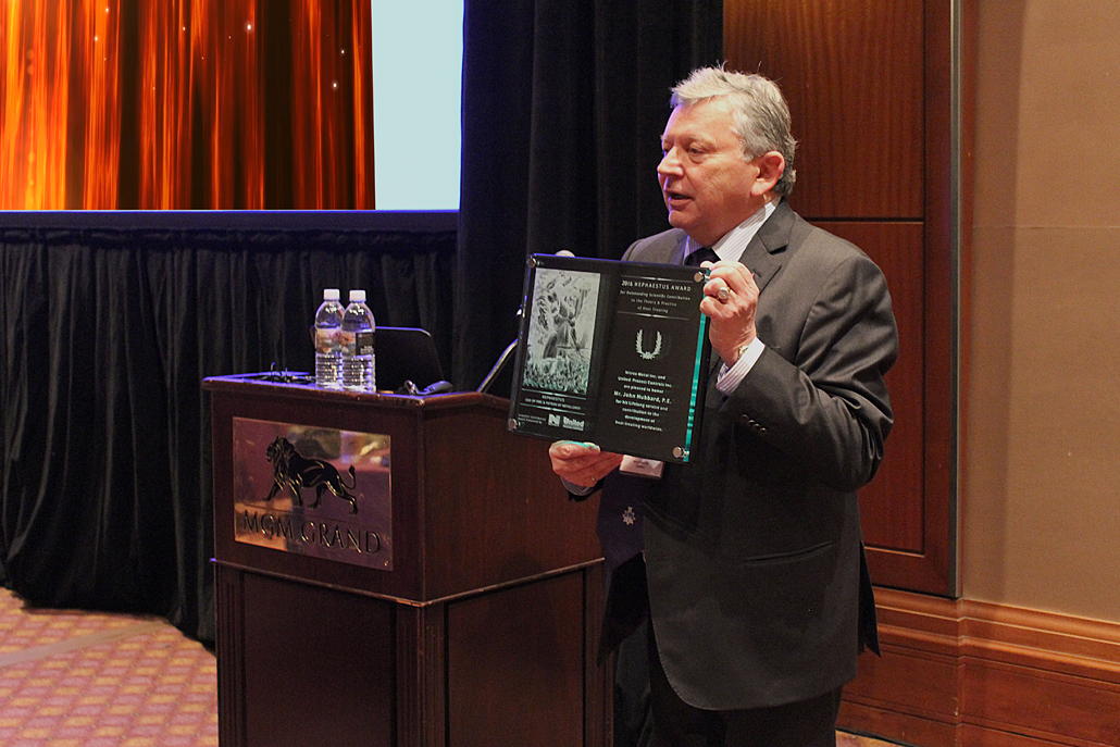 In keeping with tradition, the Hephaestus Award for honoring outstanding leaders in the heat treating community was bestowed in-absentia to Mr. John Hubbard, past CEO of Bodycote Plc, for his distinguished contributions to the development of heat treating worldwide. Mr. Hubbard delivered his acceptance speech via video, click here to view it.